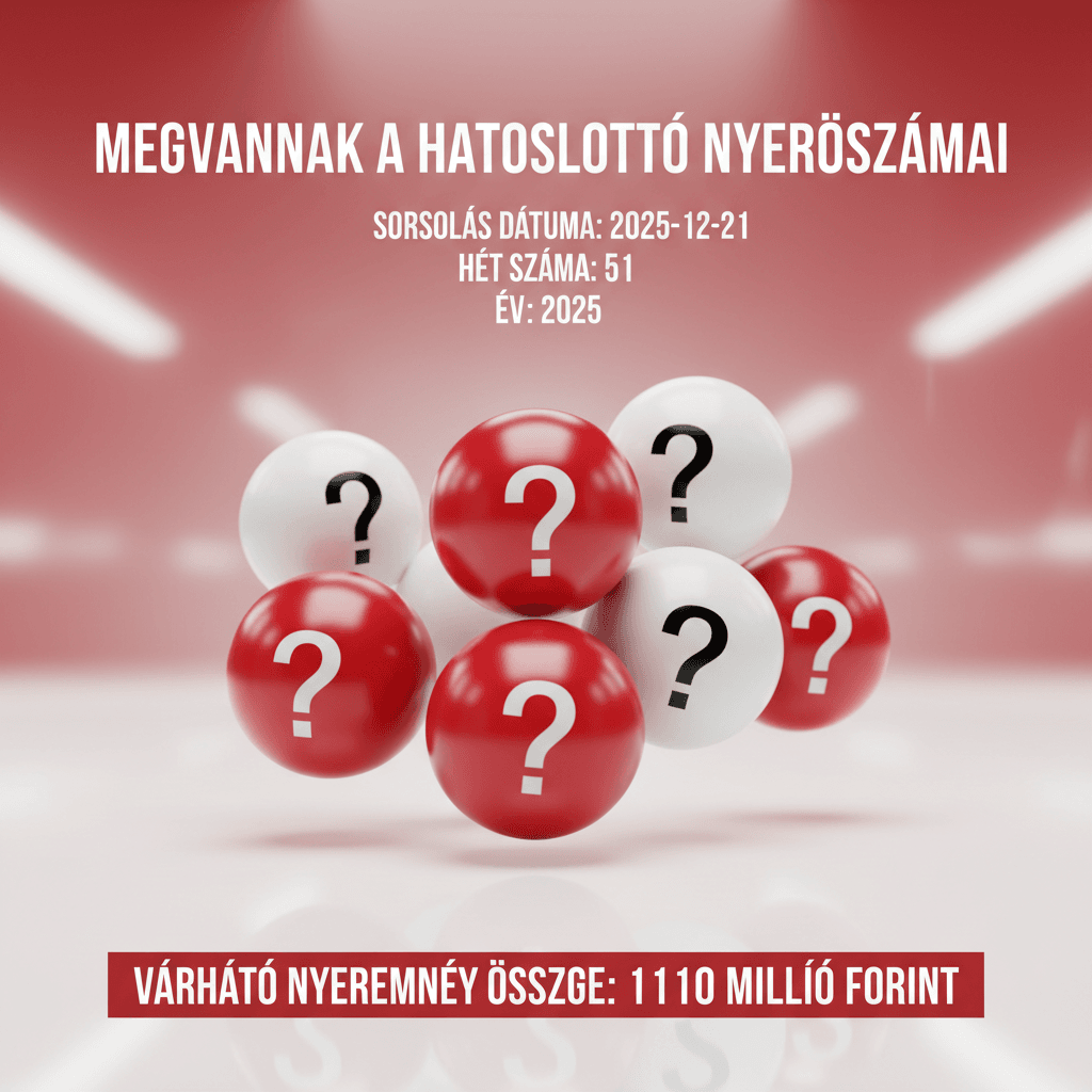 A 2025-12-21-i Hatoslottó sorsolás eredményei már elérhetők. Az 51. heti Hatoslottó nyerőszámai: 10, 11, 12, 17, 27, 36. A várható nyeremény összege 1110 millió forint. Ne feledje, a részvételi határidő minden héten csütörtök 19:00 óra.