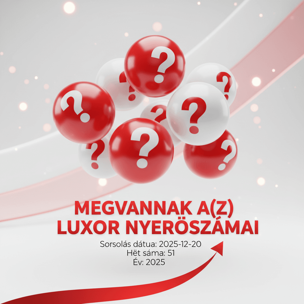 A 2025. december 20-i Luxor sorsolás már lezajlott. Az 51. heti sorsolás nyerőszámait alább tekintheti meg. A részvételi határidő szombat 14:00 óra volt.