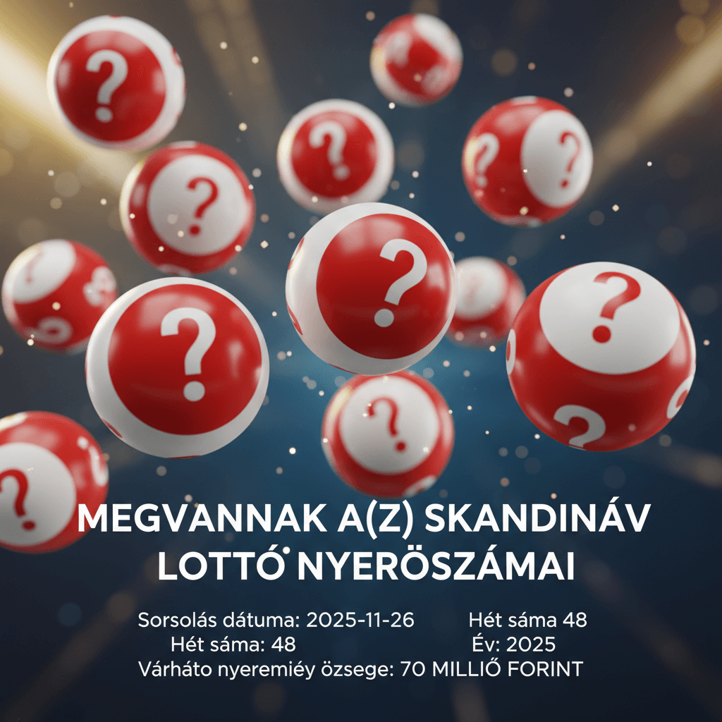 A 2025. november 26-i Skandináv Lottó sorsoláson a következő nyerőszámok kerültek kihúzásra: 2, 7, 11, 13, 18, 21, 34. A várható nyeremény 70 millió forint, a részvételi határidő szerda 18:00.